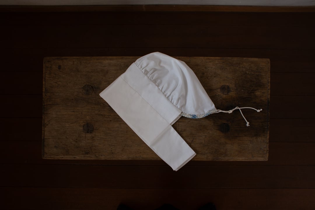こまどり菓園のあいこちゃんが、自身がお菓子をつくるときに使用したいからと探していた中世オランダの使用人が着用していた帽子。どこを探してもぜんぜん見つからないので、とうとうオリジナルで制作されました。雰囲気のあるとても素敵な作業帽子です。