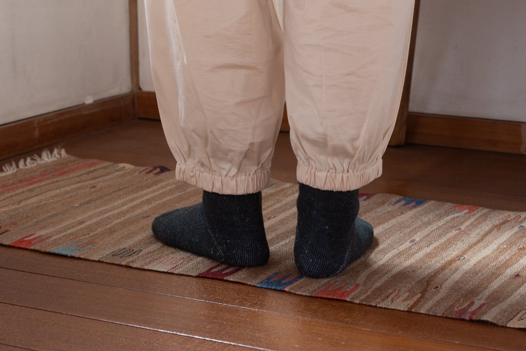 〈足の寝間着〉は、名前の通り就寝時に履くことをおすすめしている靴下。足をふんわりつつむようなそんな靴下です。