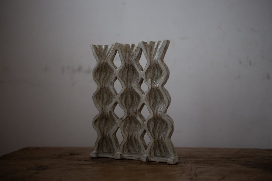 こちらは2024年の東京・神宮前「白紙」にて開催された個展「Detachment」で初めて拝見したかたち。オブジェを縦半分に切断し、3つ並べ、自立するように細工が施されています。なじみのあるモチーフに手を加えて変形することで、ガラリと印象がかわりました。視点をかえることで世界が広がることに驚きを感じた作品でした。今回、ぜひ作っていただきたいとお願いをしたかたちです。
