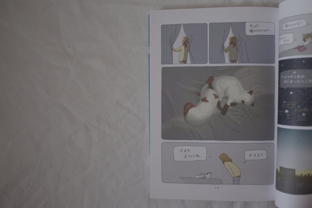 ふゆこさんという一人の女性のもとに、公園で保護された兄妹のねこアサとヨルがやってきました。一人と二匹で暮らす日々の季節を感じるおはなしが描かれています。