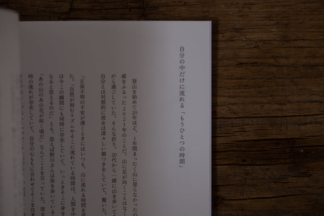 小林百合子さんの前書きを読むと、本を執筆するきっかけが書かれていた。登山をはじめてから20年ほど経つものの、コロナウィルスによるパンデミックにより1年間まったく山に登らなかった時期はこのときが初めてだったそう。先行きの見えない不安に流されそうになる中で、自らが「街の時間」と「山の時間」を行き来しながらバランスをとってきたことを思い出されました。