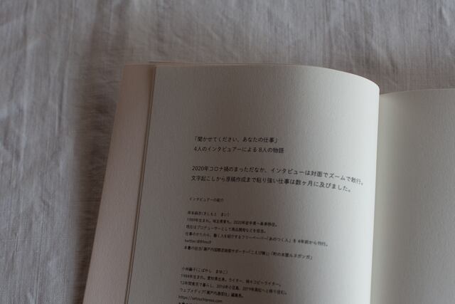 香川県に住む8人の方々へのインタビュー集です。はじめにテーマは設けずに、4人の聞き手が「仕事」と「暮らし」について8人の方にお話しを聞きまとめたものです。