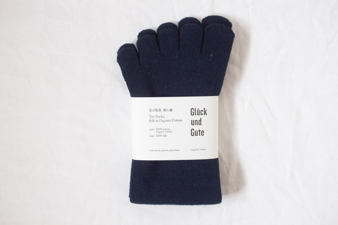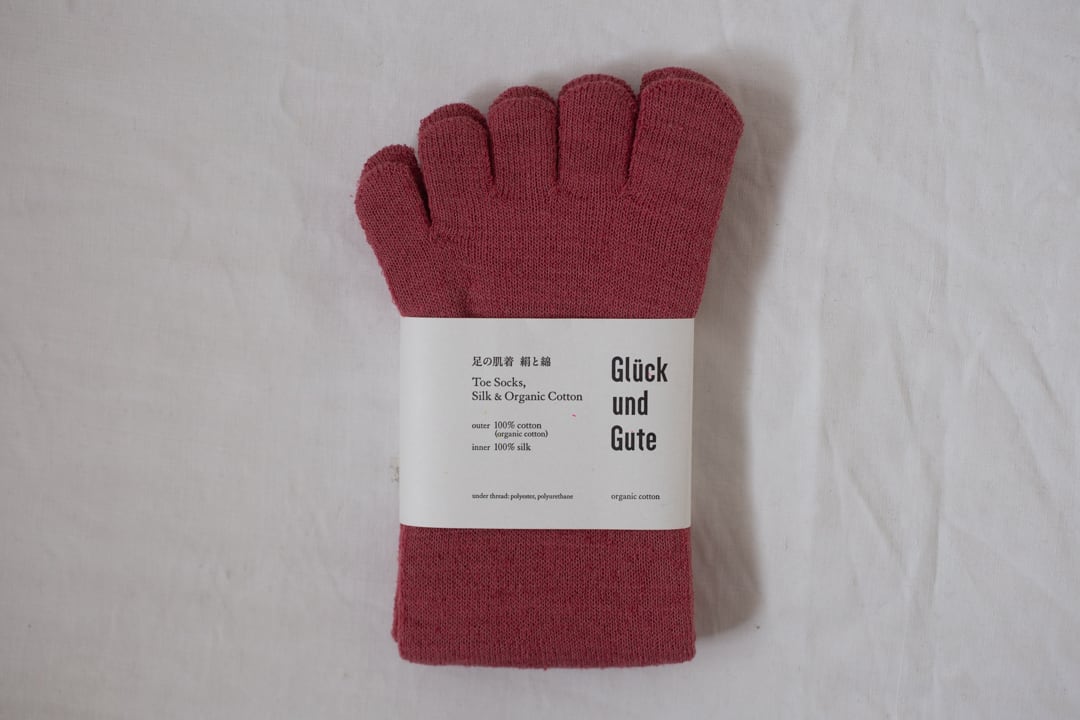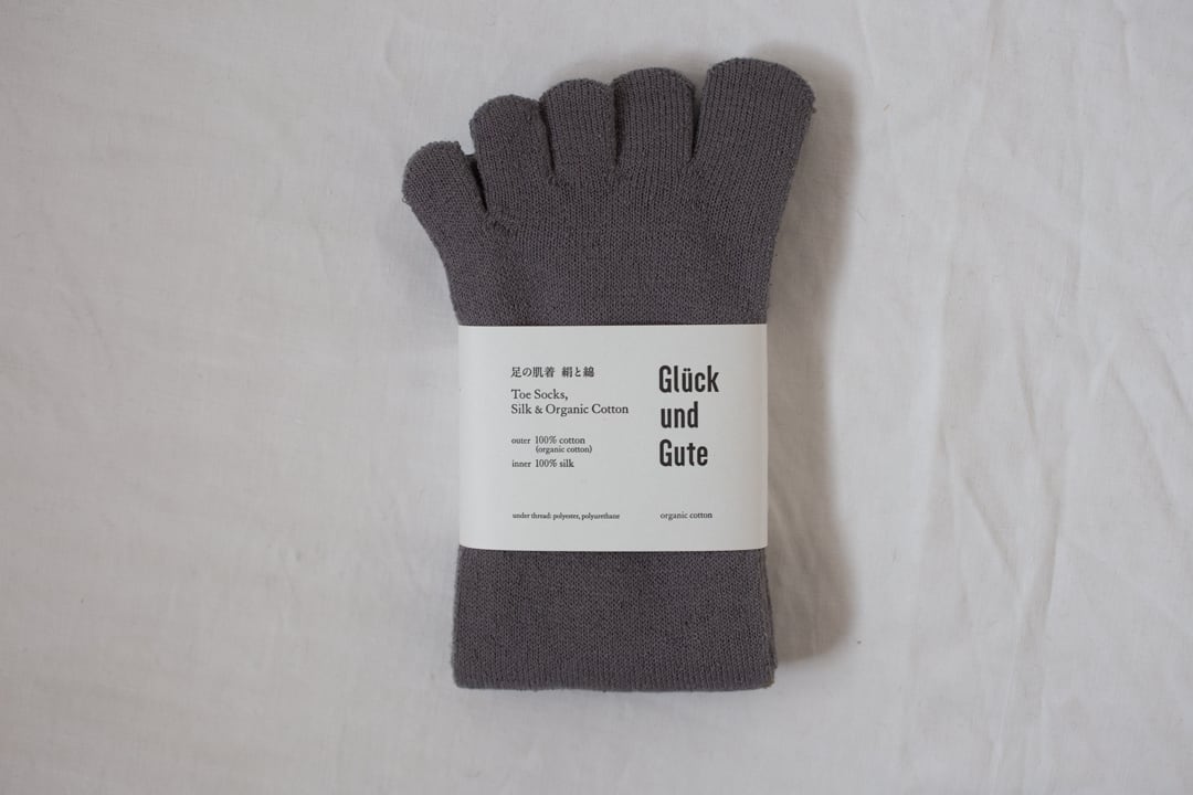 からだに心地よいもの、心が豊かなになるものをひとつひとつつくりあげているGlück und Guteの品。こちらは、定番の五本指の靴下です。