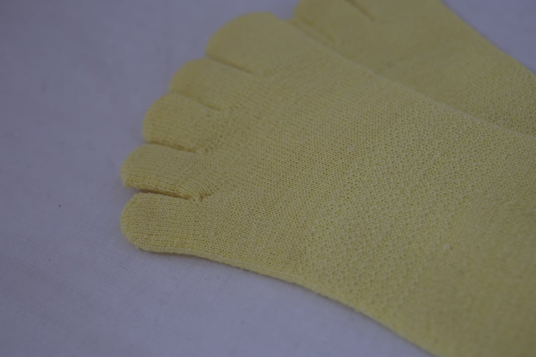 肌があたる部分はシルクの糸、外側はオーガニックコットンの糸で編み上げた五本指の靴下です。オーガニックコットンを使用することで、一般的なコットンよりもより柔らかさを感じます。