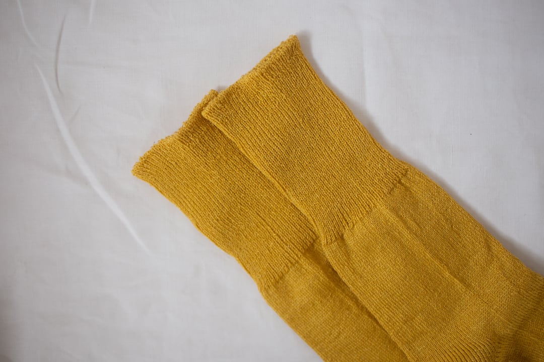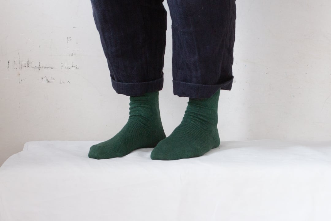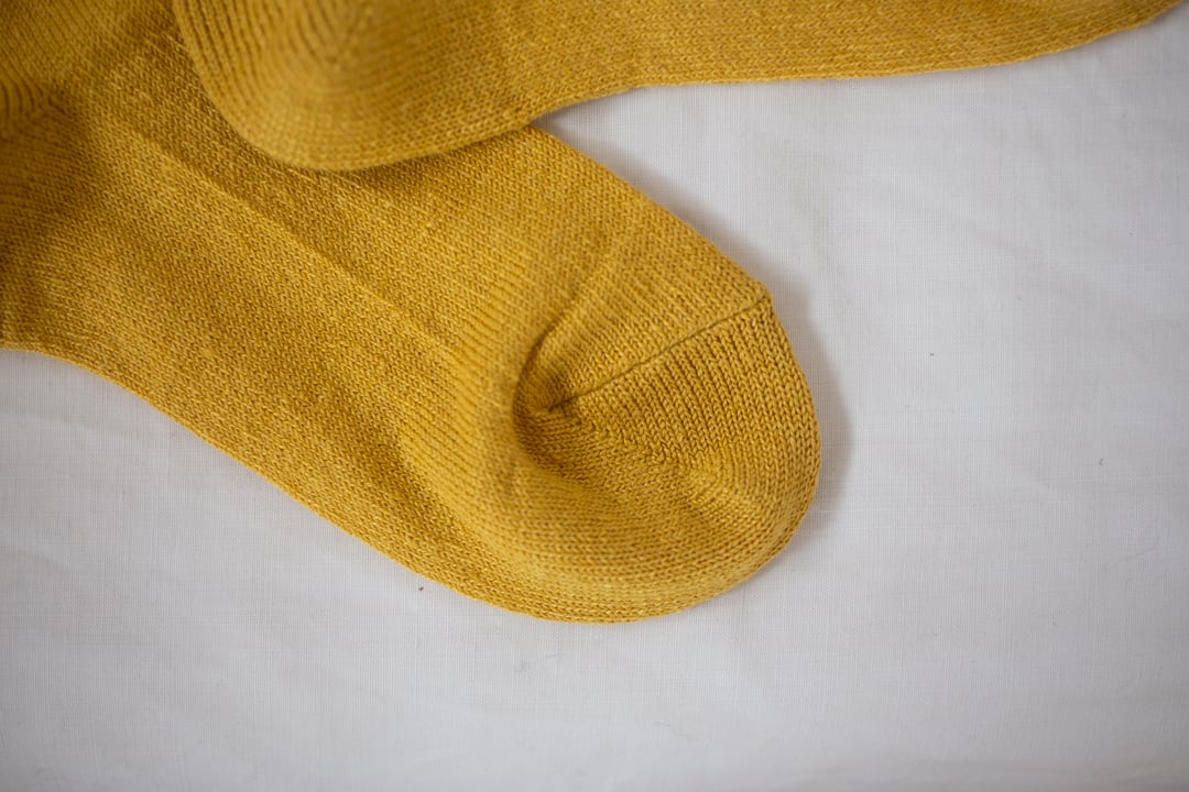 つま先やかかと部分の補強糸も麻糸を使っています。麻の靴下はシャリシャリとした手触りが気持ちよく感じます。また、洗濯をなんどもしてもしっかりしている点もこの靴下の魅力。足を締め付けることなくゆったり履いていただけるよう編みあげています。