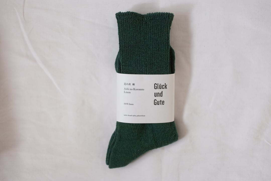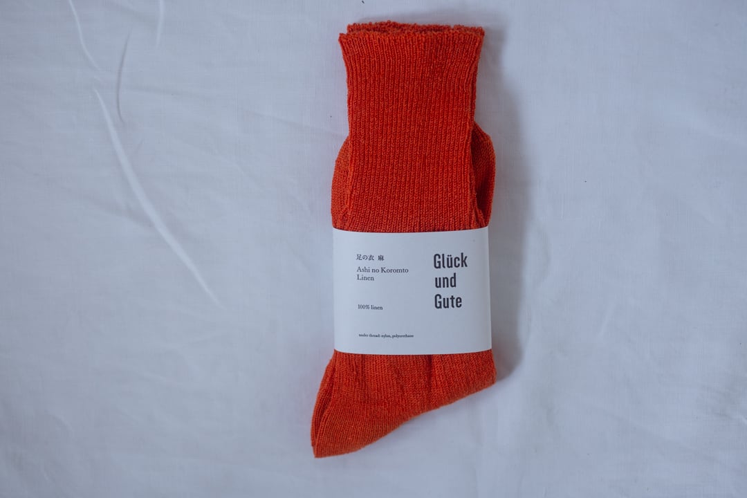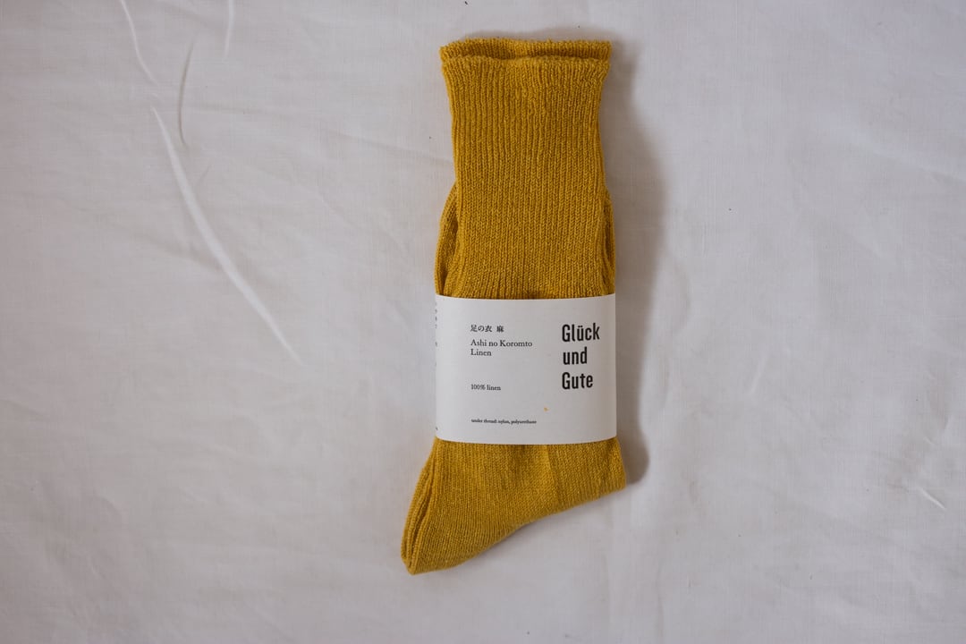 からだに心地よいもの、心が豊かなになるものをひとつひとつつくりあげているGlück und Guteの品。こちらは、麻の100%の糸で編み上げた靴下です。毎年春先から秋にかけて大活躍の靴下。